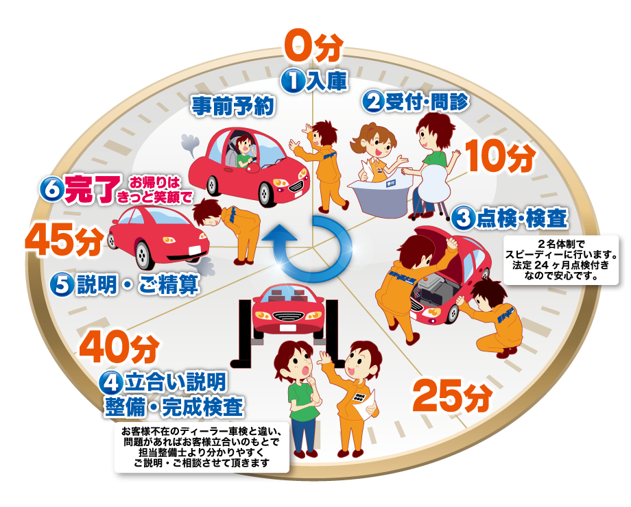 ※「カーコンビニ俱楽部 エムワイオート 林店」では車検の受付のみとなりますので、お預かり車検となります。そのため、最短45分ではなく、最短で当日でのお車のお渡しとなります。